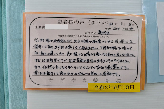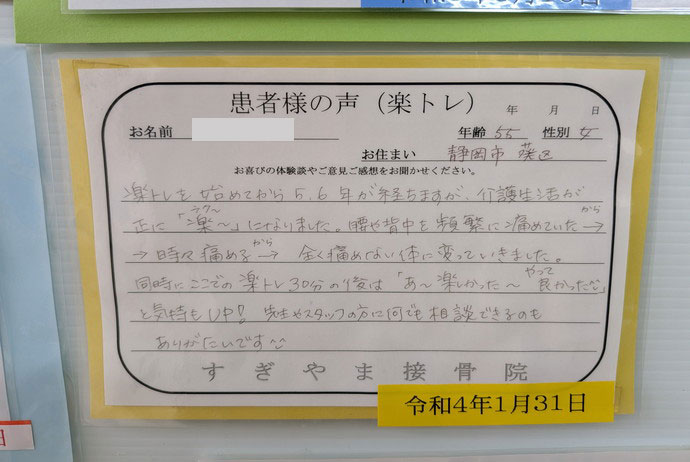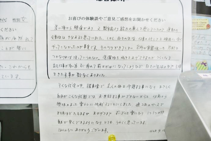 そんな状況の中、諸事情で主人の母を介護する事になり、まさしく自分がこんな状態ではお世話する事ができないからと、以前から興味のあった楽トレに挑戦することにしました。週2回のペースで8か月ほどたちますが、おかげさまでずいぶんと楽になり1つ1つの行動が早くできるようになり、とてもうれしく思っています。