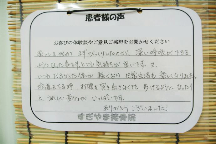 - 楽トレを始めてまずびっくりしたのが深い呼吸ができるようになった事です。