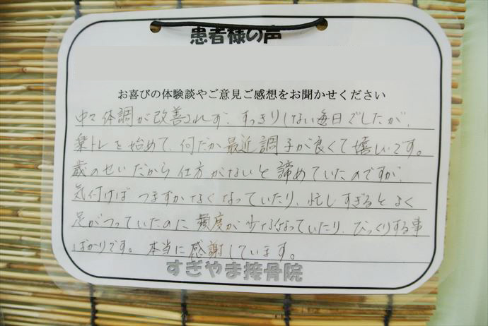 立っている事も大変で毎日が不安で辛い日が続きましたが、少しづつ成果が出て杖を使わずに歩行できることが増えてきました。先生やスタッフの方のはげましも有り、気持ちを支えて頂いて本当に感謝しています。不安をためずに相談が出来、提案を頂ける事が本当に大きいと感じています。