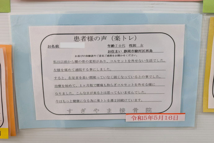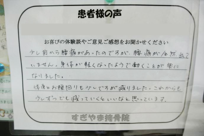 治療を始めて、1ヶ月程で腰痛も和らぎ、コルセットを外せる様になりました。こんな日が来るとは思ってもいませんでした。