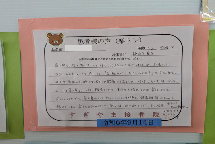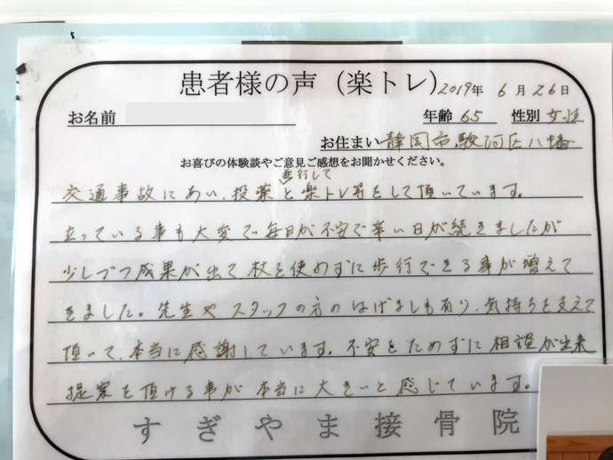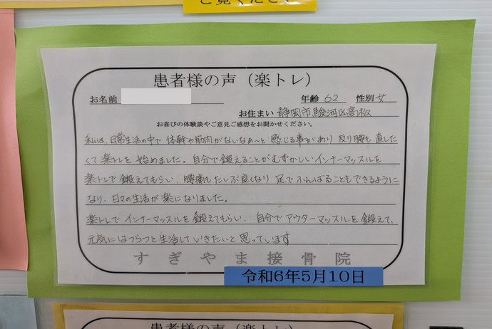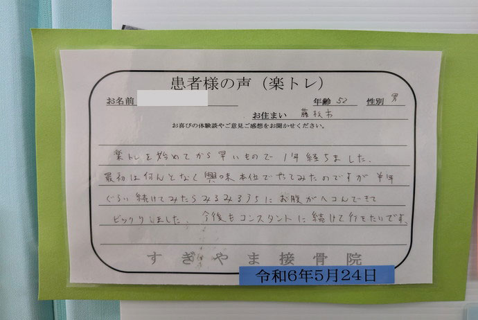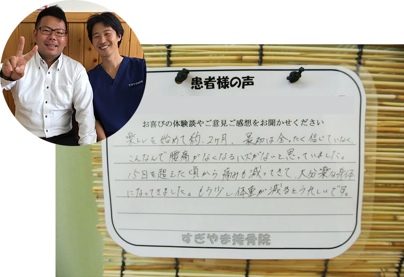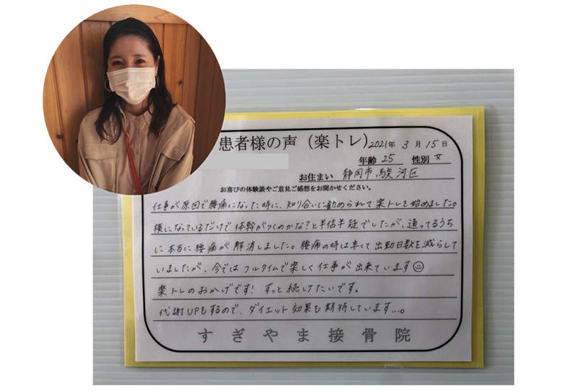 楽トレのおかげで自分の体と向き合うことができています。楽トレ杉山接骨院のおかげです。