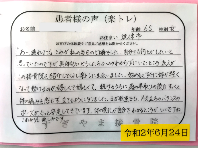 自分でも何とかしたいと思っていたのですが、具体的にどうしたらよいのかわからずにいたところ、友人がこの接骨院を紹介してくれ楽トレに出会いました。始めるとすぐに体が軽くなって動けるのが嬉しくて嬉しくて。続けるうちに庭の草取りの後もすくっと体の痛みを感じず立てるようになりました。ヨガ教室でも片足立ちのバランスのポーズがぐっと安定してきています。体の変化が自分でもわかるところがいいですね。これからも楽しみです。